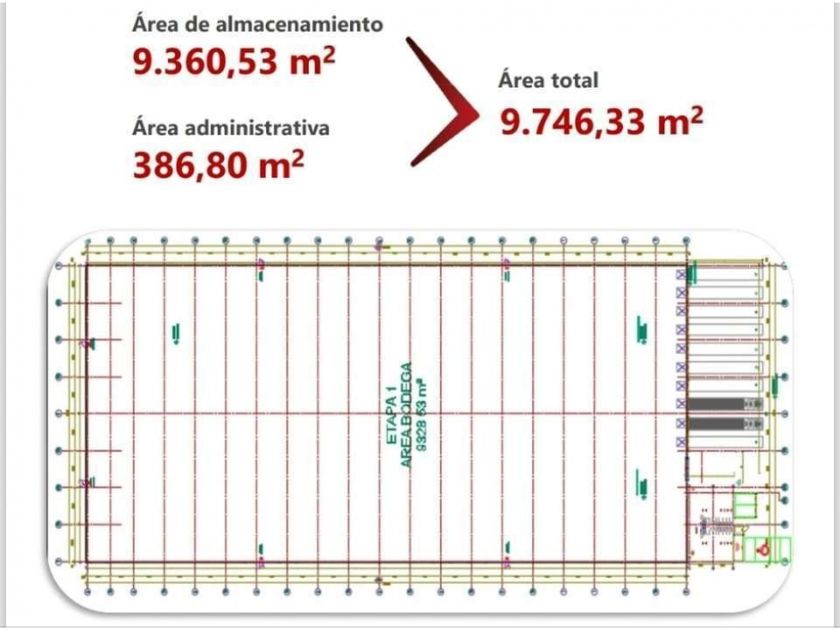 Características: Área total 9.746 m² // Área de bodega 9.360 m² // Área de oficinas 386 m² // Resistencia de piso 5 ton/m² // Red contra incendios // 10 muelles deprimidos // 1 muelle a nivel // Capacidad eléctrica 300 KVA // Altura 15 m